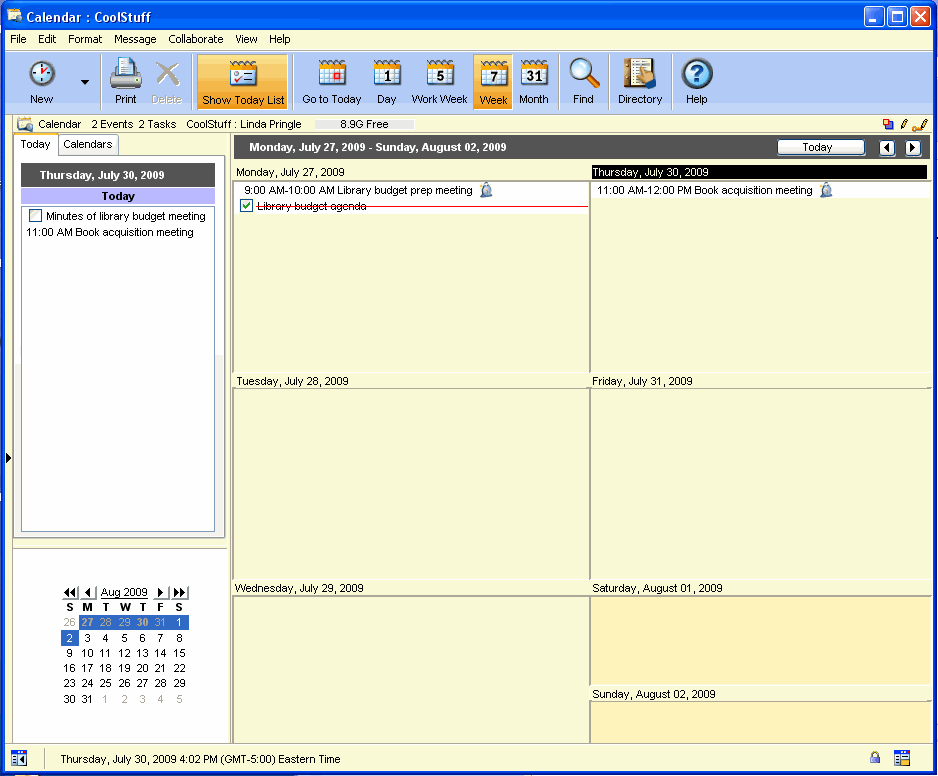 You can view a calendar in the same ways as your Mailbox, a conference, or a folder. In addition, there are special calendar views, as in the following example: