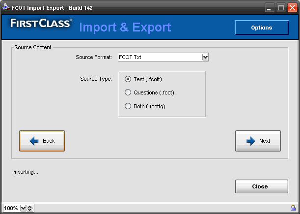 The Import/Export utility is a wizard that walks you through importing or exporting question and/or test files to/from the FirstClass Online Testing (FCOT) application. It imports or exports one file at a time, and only supported question types are imported/exported (True/False, Matching, Multiple Choice, and so on).