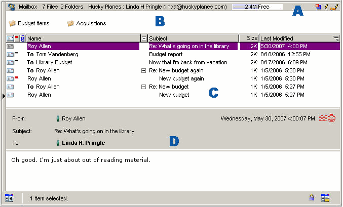 Displays a hierarchical (tree) view of FirstClass objects on top, and, when you are at your Desktop, a navigation bar on the bottom with buttons that you can click to launch FirstClass applications.