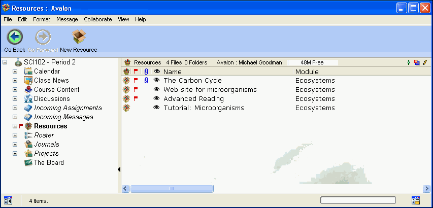 The Resources area contains additional information for students that relates to lessons that are being taught. The teacher may post additional work for extra practice, advanced work for a challenge, recommended reading, diagrams, suggested web sites, and so on.