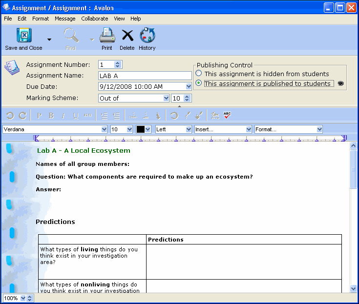This example shows a lab assignment for a Grade 8 Science classroom.