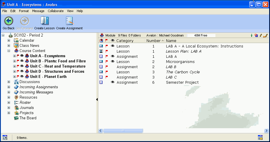 In addition to the public area of the class, the teacher has additional areas that are private to her own view: an Incoming Assignments area, Incoming Messages area, Roster, Projects area and Journals area. Also, unpublished assignments and lessons can be maintained in the Course Content area. These lessons and assignments are not visible to students until the teacher publishes them.
