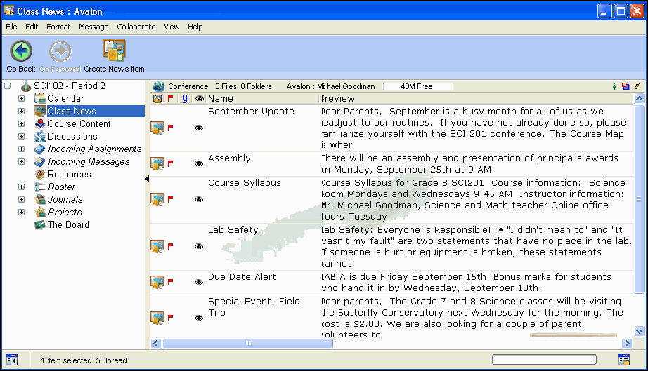 The Class News area contains information that should be read daily, such as special events, class announcements, upcoming due date alerts, and assemblies. The teacher controls when each news item is published.