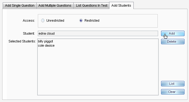 Set the Access to Restricted to limit the test to the students listed. If a test is Restricted, a listed student can access the test at any time if they know the test Grade, Subject, and Code. If a test is Unrestricted, any student can access the test at any time if they know the test Grade, Subject, and Code.